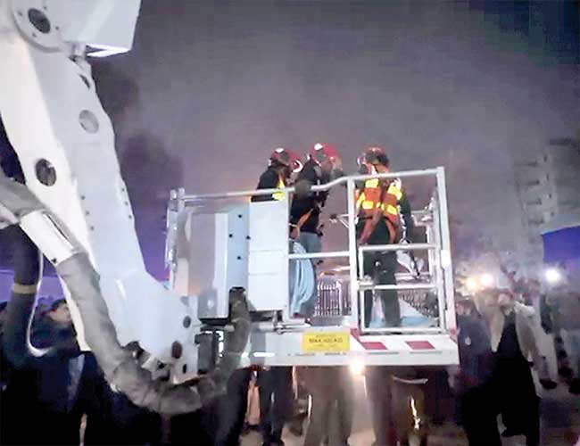 لاہور:ریسکیو اہلکار ایم پی اے ہاسٹلز کی عمارت کی تعمیر کیلئے استعمال ہونے والی کرین پر چڑھنے والے شخص کو نیچے اتارتے ہوئے