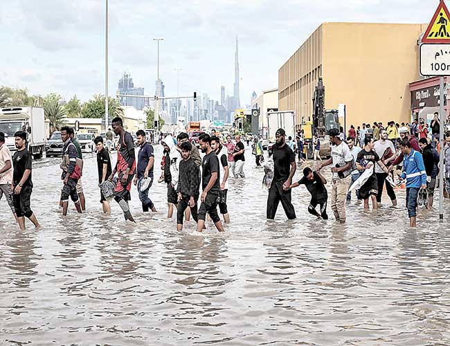 دبئی:شہری شدید بارش کے بعد سڑک پر کھڑے پانی سے گزرتے ہوئے