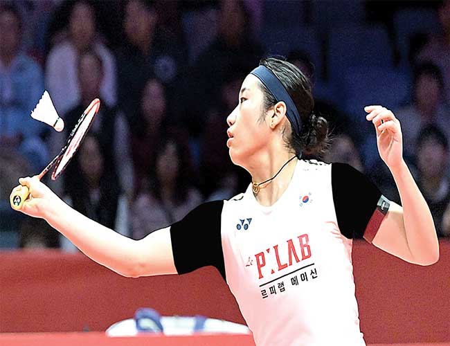 ہانگ ژو:جاپان کی آناے کیخلاف بیڈ منٹن ورلڈ ٹور فائنلز میں جنوبی کوریا کی کھلاڑی آن سی ینگ ریٹرن شاٹ کھیلتے ہوئے