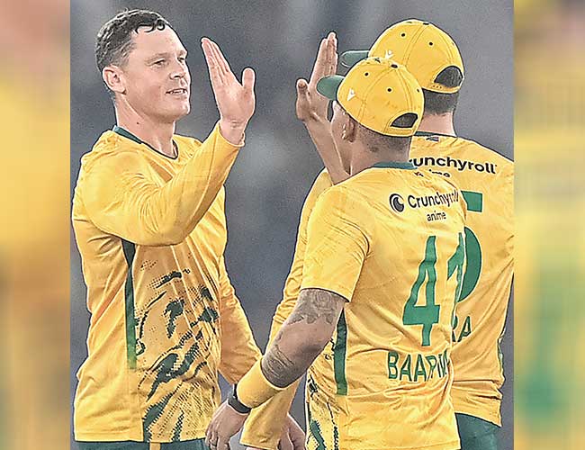 احمد آباد:بھارت کیخلاف ٹی ٹونٹی میچ میں وکٹ لینے پر افریقی کھلاڑی خوشی مناتے ہوئے