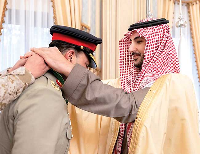 سعودی وزیر دفاع شہزادہ خالد بن سلمان فیلڈ مارشل عاصم منیر کو اعلیٰ ترین اعزاز کنگ عبدالعزیز میڈل پہناتے ہوئے