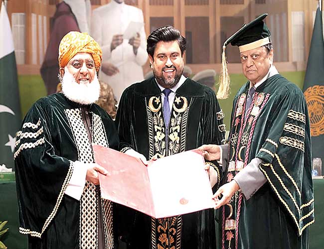 کراچی:گورنرسندھ کامران ٹیسوری کے ہمراہ سرسید یونیورسٹی کے وائس چانسلر سربراہ جمعیت علما اسلام فضل الرحمٰن کو ڈاکٹریٹ کی اعزازی ڈگری دیتے ہوئے