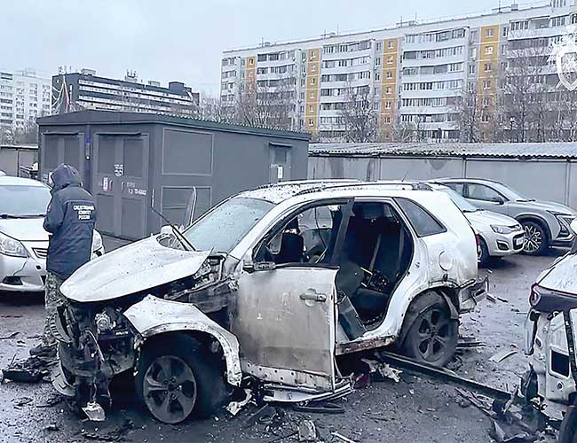 ماسکو:روسی لیفٹیننٹ جنرل فانیل سارواروف کی کاربم دھماکے میں ہلاکت کے بعد اہلکار شواہد اکٹھے کرتے ہوئے