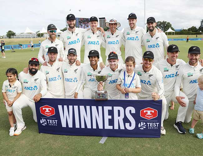 ماؤنٹ مانگانوئی:ویسٹ انڈیز سے ٹیسٹ سیریز جیتنے کے بعد نیوزی لینڈ ٹیم کا ٹرافی کیساتھ گروپ فوٹو