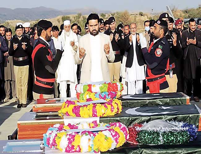 کرک:وزیراعلیٰ سہیل آفریدی شہید پولیس اہلکاروں کے جسد خاکی پر پھول رکھنے کے بعد دعا کرتے ہوئے