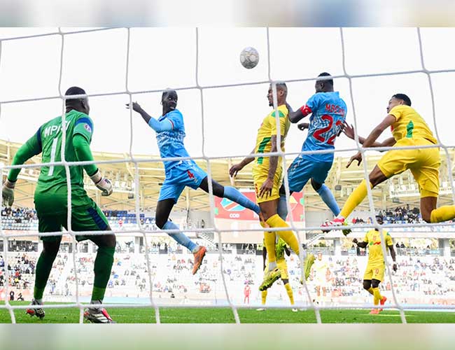 رباط:بینن کیخلاف افریقہ کپ آف نیشنز کے فٹبال میچ میں کانگو کے ڈیفینڈر ایکسل گول کرنے کی کوشش کرتے ہوئے
