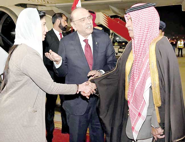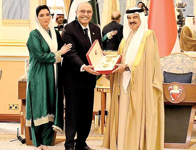 منامہ:صدر آصف زرداری کو بحرین کے شاہ حمد بن عیسیٰ اعلیٰ ترین ایوارڈ دیتے ہوئے ،آصفہ بھٹو بھی موجود ہیں