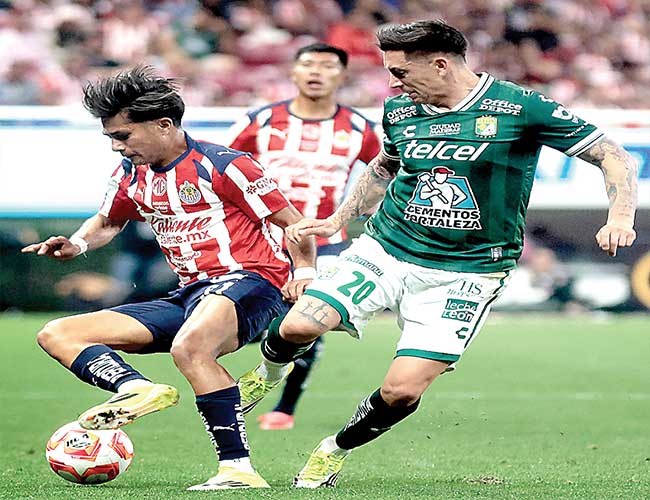 میکسیکو:گواڈلا جارا اور لیون کے فٹبال میچ میں کھلاڑی گیند کنٹرول کرتے ہوئے