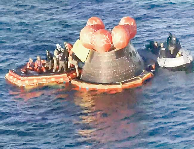 آرٹیمس ٹو کے خلابازچاند کی جانب سفر مکمل کرنے کے بعد واپسی پر بحرالکاہل میں اترتے ہوئے