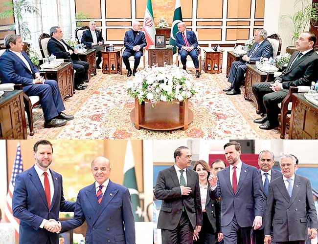 اسلام آباد:وزیراعظم شہبازشریف سے امریکی نائب صدر جے ڈی وینس اور ایرانی سپیکر باقر قالیباف کی قیادت میں وفدملاقات کرتے ہوئے ، فیلڈ مارشل عاصم منیر امریکی نائب صدر کا استقبال کررہے ہیں