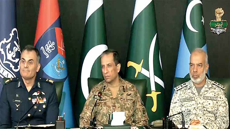 افواج کے شانہ بشانہ کھڑے ہونے پر قوم خصوصاً نوجوانوں، اختلافات سے بالا ہوکر تمام سیاسی جماعتوں کی قیادت اور درست سمت میں رہنمائی پر وزیراعظم اور کابینہ کے مشکور ہیں،تنازع نے مسئلہ کشمیر کو پھر فلیش پوائنٹ بنا دیا، ایل او سی پر جنگ بندی کی پاسداری کررہے ہیں ،کوئی بھارتی پائلٹ ہماری حراست میں نہیں۔ترجمان پاک فوج لیفٹیننٹ جنرل احمد شریف چودھری نے پاک فضائیہ کے ائیر وائس مارشل اورنگزیب احمداور پاکستان نیوی کے وائس ایڈمرل رب کے ہمراہ پریس بریفنگ میں کہا 6 اور 7 مئی کو بھارتی جارحیت کے نتیجے میں خواتین اور بچوں سمیت درجنوں شہادتیں ہوئیں، ہمارے دل اور ہمدردیاں شہدا کے اہل خانہ کے ساتھ ہیں، وطن کے دفاع میں اپنی جان کا نذرانہ پیش والے شہدا کو خراج عقیدت پیش کرتے ہیں۔انہوں نے کہا مسلح افواج نے قوم سے کیا ہوا وعدہ نبھایا جس پر ہم اللہ کے شکر گزار ہیں۔پاکستانی افواج اپنی غیور اور بہادر قوم کا شکریہ ادا کرتی ہیں، مسلح افواج کے ہر افسر، سپاہی، ایئرمین اور سیلر کے انتہائی مشکور ہیں جنہوں نے اپنی جرت اور پیشہ وارانہ مہارت اور قربانی سے میدان جنگ میں کامیابی کو ممکن بنایا۔ مسلح افواج پوری قوم خصوصاً نوجوانوں کے جذبے، حوصلے اور بھرپور حمایت پر دل کی گہرائیوں سے شکرگزار ہیں جنہوں نے مشکل ترین وقت میں ہمارے حوصلے کو بڑھایا، پاکستان کے ان نوجوانوں کے بھی مقروض ہیں جو سائبر اور انفارمیشن کے محاذ پر صف اول کے سپاہی بنے ، پاکستان کے متحرک اور بہادر میڈیا کے بھی شکرگزار ہیں جو بھارت کے پروپیگنڈا اور جنگی جنون کے خلاف آپریشن بنیان مرصوص یعنی آہنی دیوار کی طرح کھڑے ہوئے ۔