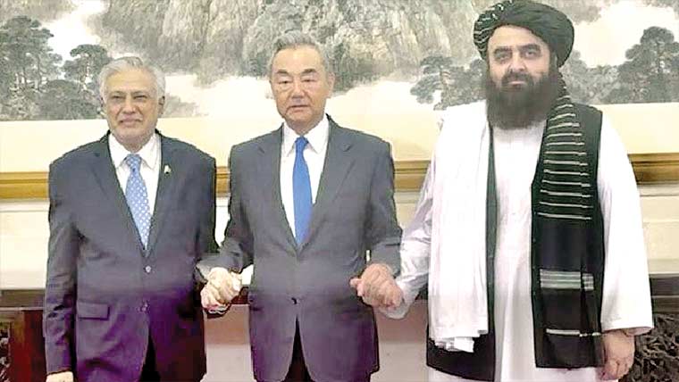 ترجمان دفتر خارجہ نے کہا ہے کہ اسحاق ڈار، چینی وزیر خارجہ اور افغانستان کے قائم مقام وزیر خارجہ امیر خان متقی کے درمیان ملاقات میں سہ فریقی تعاون کا اعادہ کیا گیا۔ وزرائے خارجہ نے خطے کی سلامتی اور اقتصادی روابط کو فروغ دینے کیلئے تعاون کے عزم کا اظہار کیا۔ اجلاس میں فیصلہ کیا گیا کہ سہ فریقی وزرائے خارجہ کا اگلا اور چھٹا اجلاس کابل میں ہوگا۔ دوسری جانب پاکستان نے طالبان حکومت کے ساتھ سفارتی روابط میں اضافہ کرنے کا فیصلہ کیا ہے ۔ وزیر خارجہ اسحاق ڈار نے بیجنگ میں قائم مقام افغان وزیر خارجہ امیر خان متقی سے بھی ملاقات کی ۔ ترجمان دفترخارجہ نے بتایا کہ وزرا خارجہ نے پاک افغان سفارتی روابط میں اضافے اور سکیورٹی کے شعبوں میں تعاون بڑھانے پر بھی اتفاق کیا ،پاک افغان تجارت اور ٹرانزٹ کی سہولیات میں بھی اضافہ کرنے پر اتفاق کیا گیا ۔ وزیر خارجہ اسحاق ڈار نے تین روزہ دورہ چین کامیابی کے ساتھ مکمل کر لیا ، یہ پاک بھارت کشیدگی کے بعد اسحاق ڈار کا پہلا غیر ملکی دورہ تھا۔ دوسری طرف پاکستان اور چین نے سرمایہ کاری، زراعت، صنعت،آئی سی ٹی میں تعاون بڑھانے اور علاقائی امن، ترقی اور استحکام کیلئے مل کر کام کرنے پر اتفاق کیا ۔ نائب وزیراعظم اور وزیر خارجہ اسحاق ڈار کی بیجنگ میں چینی وزیرخارجہ وانگ ای سے ملاقات ہوئی جس میں جنوبی ایشیا کی صورتحال، دوطرفہ تعلقات اور عالمی فورمز پر تعاون پر بھی تبادلہ خیال کیا گیا۔ اسحاق ڈار نے پاکستان اور چین کے درمیان تعاون پر مبنی سٹریٹجک پارٹنر شپ کو مسلسل مضبوط قرار دیتے ہوئے کہا ہے کہ دونوں ممالک کے درمیان باہمی اعتماد اور اشتراک نئے عروج پر پہنچ چکا ہے ۔چین کے سرکاری دورے کے اختتام پر نائب وزیراعظم اسحاق ڈار نے اس دورے کو انتہائی مفید اور اہم سفارتی پیش رفت سے عبارت قرار دیا۔