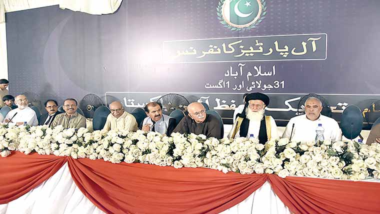 آئین اور عوامی حقوق پر مزید حملے ملک کو بند گلی میں لے جا سکتے ہیں ، تقریب سے سابق صدر اسلام آباد ہائی کورٹ بار ریاست آزاد نے کہا کہ آئین کا مذاق اڑایا جا رہا ہے ، جبری گمشدگیاں، سیاسی انتقام اور اظہار رائے کی پابندیاں مارشل لا دور کی یاد دلاتی ہیں ،کانفرنس کے اختتام پر متفقہ اعلامیہ جاری کیا گیا جس میں آئین کی بالادستی، پیکا قانون کا خاتمہ، لاپتہ افراد کی بازیابی، سیاسی قیدیوں کی رہائی، غیر جانبدار الیکشن کمیشن ،اظہار رائے کی مکمل آزادی کا مطالبہ کیا گیا ، مقررین نے کہا کہ حکومت تنقید سے نہ گھبرائے ، بلکہ آئین کے طے شدہ دائرے میں کام کرے ۔اس موقع پر سینئر سیاستدان جاوید ہاشمی نے قائداعظم کی جدوجہد کا حوالے دیتے ہوئے کہا کہ قائداعظم نے آئین جمہوریت اور پارلیمانی نظام کی بات کی تھی۔ آج ہم اسی دستور کی بقا کے لئے جمع ہیں ،کانفرنس میں زین شاہ، علامہ راجہ ناصر عباس، اسد قیصر دیگر رہنماؤں نے بھی خطاب کیا اور کہا کہ اگر سیاسی میدان خالی کیا گیا تو غیر جمہوری قوتیں اسے پُر کریں گی، جس کے خطرناک نتائج نکل سکتے ہیں ،آل پارٹیز کانفرنس آج بھی ہوگی جس میں احتجاجی تحریک پلان کی منظوری اور شیڈول جاری کیا جائے گا،ذرائع کے مطابق بانی پی ٹی آئی نے بھی پارٹی قیادت کو اب محمود خان اچکزئی کی سربرا ہی میں تحریک چلانے کی ہدایات کی ہیں ۔