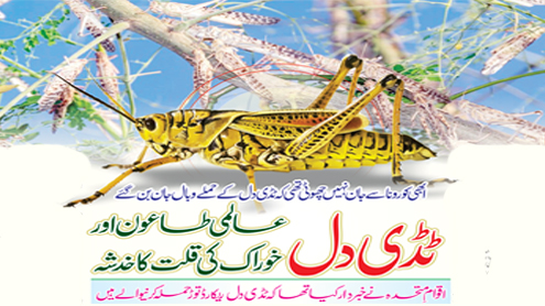 یہ قدرت کا اظہار ناراضی ہے یا انسان کی بدترین غفلت کا نتیجہ کہ ایک کے بعد ایک آفت آ رہی ہے۔۔۔ ابھی قوم کی جان کورونا سے نہیں چھوٹی کہ ٹڈی دل نے محتاط اندازے کے مطابق تقریباً 1ہزار ارب کا نقصان کر دیا۔۔۔یہ ٹدی دل کسی ایک ملک کے نہیں بلکہ سب کے دشمن ہیں ۔ تشویشناک امر یہ ہے کہ اس وقت ملک کے 50 سے زائد اضلاع میں ٹڈی دل موجود ہیں بلوچستان میں 31، خیبر پختونخوا میں 8، پنجاب میں 9 اور سندھ میں 2 اضلاع متاثر ہیں۔ حملہ زدہ علاقوں کا سروے اور کنٹرول آپریشن جاری ہے۔۔