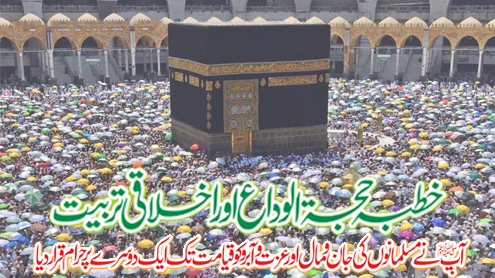 خطبہ حجۃ الوداع اور اخلاقی تربیت آپﷺ نے مسلمانوں کی جان و مال اور عزت و آبرو کو قیامت تک ایک دوسرے پر حرام قرار دیا