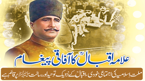 ملتِ اسلامیہ کی اجتماعی خودی، اقبالؒ کے نزدیک دو ستونوں پر قائم ہے:’’ توحید اور رسالت۔ توحید کا مطلب انسانیت کی وحدانیت اور رنگ، نسل یہاں تک کہ حیثیت کی تفریق کا خاتمہ بھی ہے۔ توحید پر یقین ہم میں نا امیدی، غم اور خوف کا خاتمہ بھی کرتا ہے۔حضرت محمدﷺ کی رسالت پر ایمان ہماری قوم کا دوسرا ستون ہے۔ فرد کا وجود خدا کے ساتھ تعلق سے قائم ہے مگر ملت کے وجود کی بنیاد ہی پیغمبرﷺ ہیں جو تمام دنیا کے لیے رحمت ہیں۔ نبوتِ محمدی ﷺ کا مقصد انسانوں کے درمیان بھائی چارہ، مساوات اور آزادی کا قیام ہے۔ چونکہ مسلم برادری عقیدہ توحید و رسالت پر قائم ہے اس لیے زمان و مکاں کی حدود سے بلند ہے۔ قوم کی تنظیم آئین کے ذریعے ہی ممکن ہے اور مسلم قوم کا آئین قرآن ہے۔ملت کا حصول سیرتِ رسولﷺ کے آداب اختیار کرنے سے ہے‘‘۔وہ مسلمانوں سے مخاطب ہوتے ہیں کہ تمھارا ایمان رسومات کا غلام بن گیا ہے، اپنی زندگی کا مقصد براہِ راست قرآن سے تلاش کرو۔آخر کب تک مادی خواہشات کے غلام رہو گے؟ خود کو سورہ اخلاص سے منور کرو۔انسانوں کو اجتماعی خودی کا درس دیتے ہوئے اقبالؒ بتاتے ہیں کہ زندگی دو قوتوں کو جنم دیتی ہے۔ پہلی فرعون اور یزید کی شکل میں ظاہر ہوتی ہے اور دوسری حضرت موسیٰؑ اور امام حسین ؓ کی شکل میں۔ تمھیں چراغ کا نور بننا اور اس دنیا کو چمکانا ہے۔