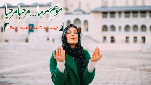 برکتوں کا موسم:حضرت عبداللہ بن مسعود ؓ مرفوعاً فرماتے ہیں’’سردی کو خوش آمدید! اس موسم میں برکتیں نازل ہوتی ہیں وہ اس طرح کہ اس میں تہجد کے لئے رات لمبی جبکہ روزہ رکھنے کے لئے دن چھوٹا ہوتا ہے۔ (المقاصد الحسنۃ للسخاوی، حدیث نمبر 588)
