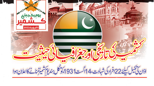 اذان کی تکمیل کیلئے 22افراد کی شہادت،14اگست 1931ء کو ’’کُل ہند یوم کشمیر‘‘ منانے کا اعلان ہوا 1339ء سے 1818ء تک مقبوضہ کشمیر پر مسلمان حکمران رہے ،1819ء میں رنجیت سنگھ نے لشکر کشی کی ،1846ء میں برطانوی سامراج نے کشمیر پر قبضہ کر لیا