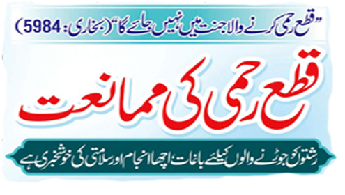 اسی طرح نبی کریم ﷺ نے ارشاد فرمایا ’’قطع رحمی کرنے والا جنت میں نہیں جائے گا‘‘۔ (بخاری: 5984)۔ ایک اور حدیث میں ارشاد فرمایا ’’اس قوم پر رحمت نہیں اترے گی جس میں کوئی رشتوں کو توڑنے والا موجود ہو‘‘ (الادب المفرد: 63)۔