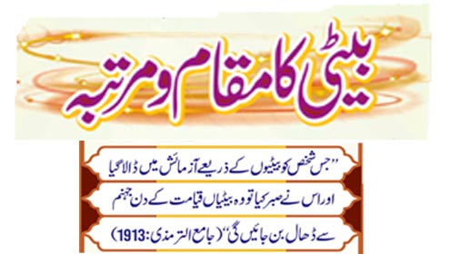بیٹی اللہ کا انمول تحفہ ہے، اسلام ہمیں یہ حکم دیتا ہے کہ بچی کی پیدائش کو منحوس نہ سمجھا جائے بلکہ اس پر شکر ادا کرتے خوش ہونا چاہیے،اس کا اچھا اسلامی نام رکھا جائے، اس کی تربیت میں کوئی کسر نہ چھوڑی جائے، عمدہ تعلیم سے آراستہ کیا جائے، گھریلو کام کاج کا خوگر بنایا جائے، نسبت اچھی قائم کی جائے، نکاح جلدی کیا جائے،اس کی ضرورتوں کو پورا کیا جائے۔