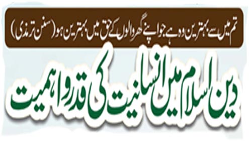 حضور ﷺ نے ارشاد فرمایا ’’تم میں سے بہترین شخص وہ ہے جو اپنے گھر والوں کے حق میں بہترین ہو(سنن ترمذی،صحیح ابن حبان)۔ حضور ﷺ نے ارشاد فرمایا جو دنیا میں کسی مصیبت زدہ سے کسی دنیاوی تکلیف اور مصیبت کودور کر دے (یا دورکرنے میں مدد کرے)تو اللہ تعالیٰ اس سے قیامت کے دن اُخروی مصیبت کو ہٹا دیں گے نیز جودنیا میں مشکلات میں گھرے ہوئے کسی شخص کیلئے آسانی پیدا کرنے کی کوشش کرے تواللہ تعالیٰ اس کیلئے (دونوں جہاں کی) آسانیاں پیدا فرما دیں گے اور اللہ تعالیٰ اس بندے کی مسلسل مدد فرماتے ہیں جو کسی اپنے بھائی کی مدد کرتا ہے(ترمذی)۔