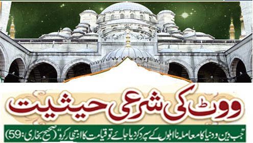 انتخابات میں کسی امیدوار کو ووٹ دینے کے لحاظ سے ووٹ شرعی اعتبارسے چند حیثیتیں رکھتاہے ، (1)شہادت، (2) سفارش،(3)حقوق کی وکالت، (4)امانت۔