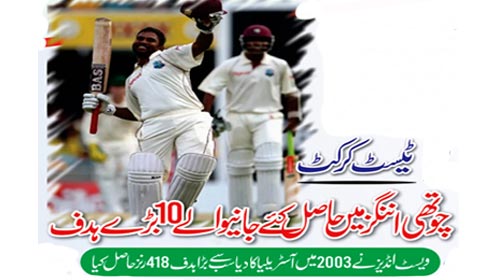 کرکٹ ٹیسٹ میچ کی چوتھی اننگز میںرنزکے بڑے ہدف کو عبور کرنا بہت جان جوکھوں کا کام ہوتاہے اور آج تک زیادہ سے زیادہ 418 رنز کا ہدف حاصل کیا جا سکا اور 400سے اوپر رنز کے ہدف تک ٹیسٹ کرکٹ کی 148سالہ تاریخ میں محض 4بار پہنچا جا سکا۔