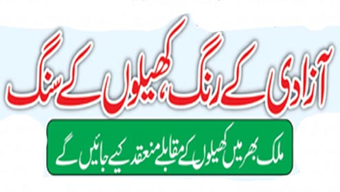 پاکستان سپورٹس بورڈ(پی ایس بی) یوم آزادی کے موقع پر کھیلوں کے ذریعے قومی جذبے کواجاگر کرنے کیلئے یکم سے 31 اگست تک مختلف مقابلوں کا انعقاد کرنے کا اعلان کیا ہے۔ اسی طرح سپورٹس اینڈ یوتھ افیئرز ڈیپارٹمنٹ پنجاب کے زیر اہتمام بھی جشن آزادی کو شایان شان طریقے سے منانے کیلئے تیاریاں جاری ہیں۔ ڈی جی سپورٹس پنجاب خضر افضال چودھری نے جشن آزادی پر فیملی فن ریسز کا اہتمام کیا ہے ۔ تین فن ریسز کے بعد پنجاب سٹیڈیم میں ملی نغموں اور ترانوں کا پروگرام تشکیل دیا گیا ہے۔لاہور کے مختلف علاقوں میں رجسٹریشن بوتھ قائم کیے گئے ہیں، فن ریس حالی چوک سے پنجاب سٹیڈیم تک ایک کلومیٹر ہو گی۔