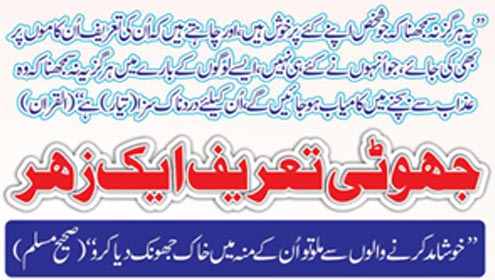 ’’خوشامد کرنے والوں سے ملو تو اُن کے منہ میں خاک جھونک دیا کرو‘‘(صحیح مسلم ) ’’یہ ہرگز نہ سمجھنا کہ جو شخص اپنے کئے پر خوش ہیں، اور چاہتے ہیں کہ اُن کی تعریف اُن کاموں پر بھی کی جائے، جو اُنہوں نے کئے ہی نہیں، ایسے لوگوں کے بارے میں ہرگز یہ نہ سمجھنا کہ وہ عذاب سے بچنے میں کامیاب ہوجائیں گے، اُن کیلئے دردناک سزا (تیار) ہے‘‘ (القران)نبی کریم ﷺ نے ایک شخص کو دوسرے کی مبالغہ آمیز تعریف کرتے سنا تو فرمایا ’’ تم نے اِس کو برباد کردیا‘‘ (صحیح بخاری)