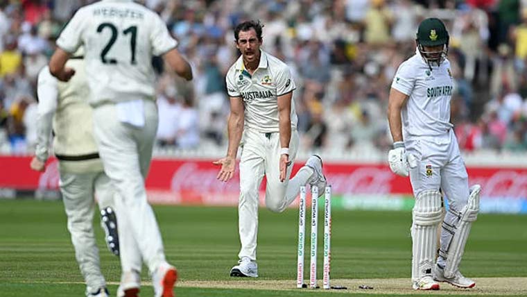 ایڈن مارکرم 102 اور کپتان ٹیمبا باووما 65 رنز کے ساتھ کریز پر موجود ہیں۔لندن کے تاریخی لارڈز سٹیڈیم کھیلے جا رہے چیمپئن شپ فائنل میں جنوبی افریقا کی 282 رنز کے تعاقب میں بیٹنگ جاری ہے ۔آئی سی سی ٹیسٹ چیمپئن شپ فائنل کے تیسرے روز آسٹریلیا نے 8 وکٹوں کے نقصان پر 144 رنز کیساتھ اننگز کا آغاز کیا، تاہم دن کے آغاز پر نیتھن لائن کی پہلی وکٹ گری، جو محض 2 رنز بناکر پویلین روانہ ہوئے ۔جوش ہیزل ووڈ 17 رنز بناکر آؤٹ ہوگئے جبکہ مچل سٹارک 58 رنز کے ساتھ ناٹ آؤٹ رہے ۔ کینگروز نے جنوبی ا فریقا کو ٹائٹل جیتنے کے لیے 282 رنز کا ہدف دیا۔جنوبی افریقا کی جانب سے کیگیسو ربادا اور ایڈن مارکرم نے ایک، ایک وکٹ حاصل کی۔ہدف کے تعاقب میں جنوبی افریقا نے 2 وکٹوں کے نقصان پر 213 رنز بنا لیے اور اس وقت کریز پر ایڈن مارکرم 102 جبکہ کپتان ٹیمبا باوما 65 رنز کے ساتھ موجود ہیں۔ریان رکلٹن 6 اور وائن مولڈر 27 رنز بنا کر آؤٹ ہوئے ۔ جنوبی افریقا کے دونوں کھلاڑی مچل سٹارک کا شکار بنے ۔دوسرے روز آسٹریلیا کی ٹیم نے 74 رنز کی برتری کے ساتھ دوسری اننگز کا آغاز کیا تھا لیکن دن کے اختتام پر 144 رنز پر 8 وکٹیں گنوا بیٹھی۔ ٹیم کی مجموعی برتری 218 رنز تک پہنچ گئی تھی۔