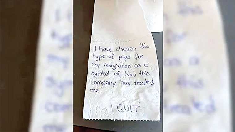 ملازم نے لکھا کہ میں نے خود کو ٹوائلٹ پیپر کی طرح محسوس کیا ہے جسے ضرورت پڑنے پر استعمال کیا گیا اور بعد میں بغیر کسی سوچ کے پھینک دیا گیا۔اس جذباتی نوٹ کا اختتام ان الفاظ پر ہوا کہ میں نے استعفے کے لیے اسی کاغذ کا انتخاب اس لیے کیا ہے تاکہ یہ ظاہر کر سکوں کہ کمپنی نے میرے ساتھ کیسا سلوک کیا، میں استعفیٰ دے رہا ہوں۔کمپنی کی ڈائریکٹر اینجیلا یہو نے اس انوکھے استعفے کو عوام کے ساتھ شیئرکرتے ہوئے اعتراف کیا کہ یہ واقعہ ان پر گہرا اثر چھوڑ گیا، ملازمین کے ساتھ ایسا رویہ رکھیں کہ جب وہ کمپنی چھوڑیں تو دل میں شکرگزاری ہو، نہ کہ کینہ۔