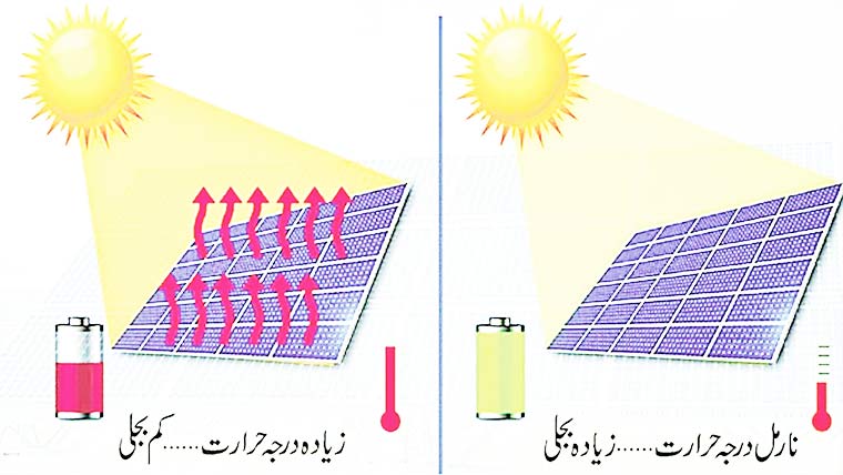 جدید سولر پینل 15 سے 25 درجے سینٹی گریڈ میں بہترین کام کرتے ،گرمی 25C سے بڑھے تو ہر 1 درجےا بڑھاؤ پر پینل کی کارکردگی0.3 سے 0.5 فیصد کم ہو جاتی ہے کہ سولر سیلوں میں بجلی پیدا کرتے الیکٹرون (ایٹم) حد سے زیادہ باؤنس کرتے ہیں، یوں وولٹیج کم جنم لیتا اور بجلی بھی کم بنتی ہے ۔ماہرین کی روسے شدید گرمی میں پینلوں کی کارکردگی بہتر رکھنے کیلئے یہ عمل کیجیے ، چھت پہ پینل سٹینڈ پر لگائیے ، پینلوں کا رنگ ہلکا ہو اور وہ ریفلیکٹیو میٹریل سے بنے ہوں، دیگر متعلقہ آلات سائے میں لگوائیے ۔یاد رہے ، ‘‘مونوکرسٹلائن’’ سولر پینل عام موسم میں زیادہ بجلی بناتے مگر شدید گرمی میں اچھا کام نہیں کرتے ، ‘‘پولی کرسٹلائن’’ پینل شدید دھوپ میں بھی اپنی کارکردگی بحال رکھتے ہیں۔